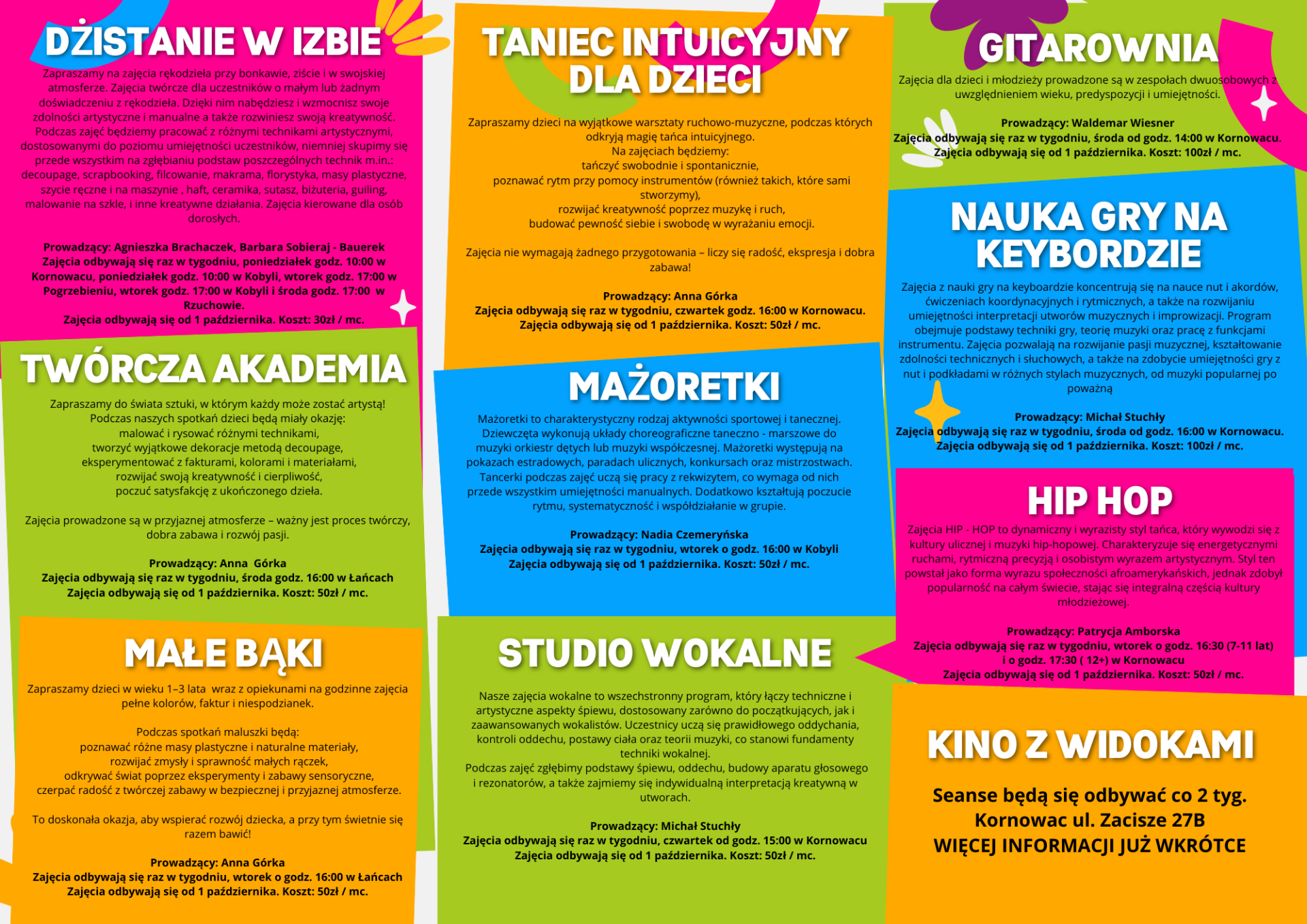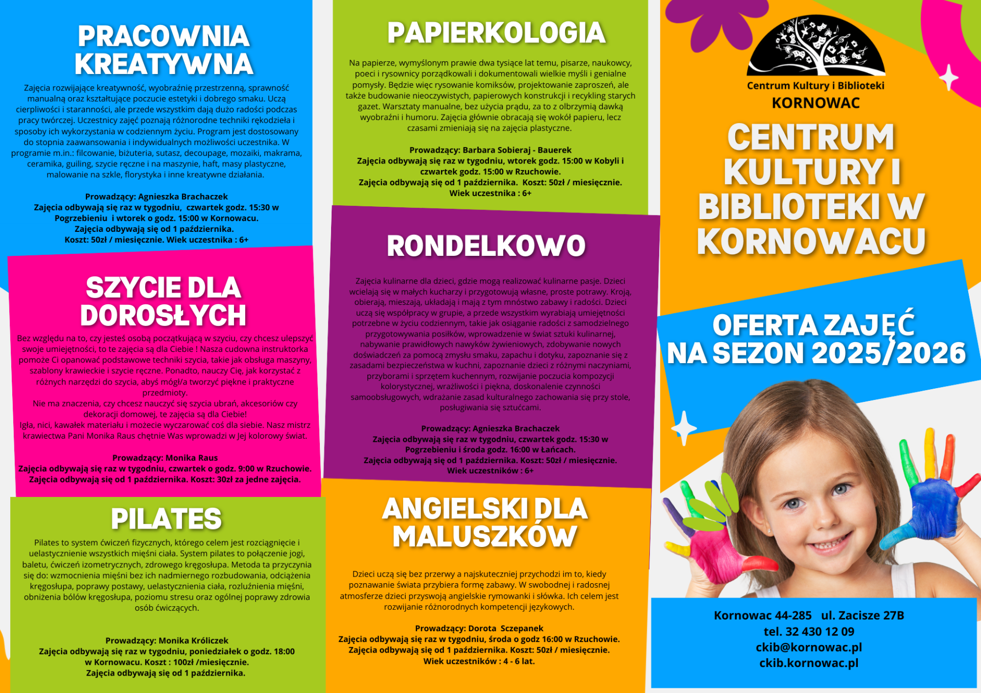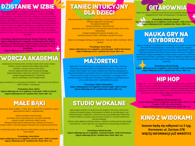 Oferta zajęć na sezon 2025/2026 Zapisy ruszają od 15.09 Zapraszam do zapoznania się z ofertą. Galeria zdjęć Drukuj Kopiuj link Facebook.com X.com Data publikacji: 10.09.2025 godz. 10:51 Wyświetlono: 161 Kategoria: Aktualności Zobacz również Zobacz więcej 03.07.2025 Aktualności Akcja lato 2025 Akcja Lato 2025 Serdecznie zapraszamy na pierwszą część atrakcji jakie przygotowaliśmy dla Was na tegoroczne wakacje. Spieszcie się z zapisami bo ilość miejsc jest ograniczona. Zapraszamy i... 08.08.2025 Aktualności Nowe Centrum Kultury i Biblioteki w Kornowacu Nowe CKiB to nie tylko przestrzeń dla kultury i edukacji – w budynku swoją siedzibę znalazły również:• Ośrodek Pomocy Społecznej w Kornowacu• Gminna Komisja Rozwiązywania Problemów... 09.09.2025 Aktualności Podsumowanie Akcji Lato 2025 Akcja Lato 2025 zorganizowana przez Centrum Kultury i Biblioteki w Kornowacu przyniosła dzieciom i młodzieży wiele niezapomnianych chwil pełnych kreatywności, radości i nauki poprzez zabawę. Podczas...
