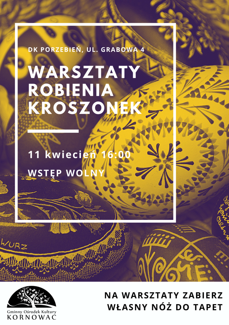 Warsztaty odbędą 11 kwietnia o 16:00 w Domu Kultury w Pogrzebieniu przy ul. Grabowej 4. Prosimy o przyniesienie własnych nożyków do tapet. Do udziału w warsztatach zachęcamy osoby powyżej 12 roku życia i dorosłych.